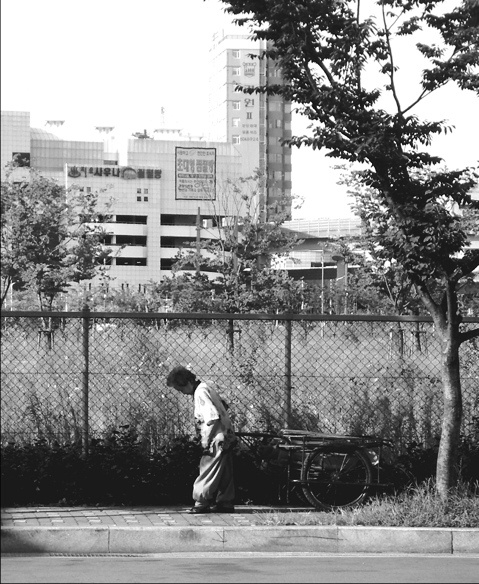 삭막한세상에 밀려나 들어서지 못하게하는 철조망.. 초대형이라 써있는 큰 건물이 노인을 더 작아보이게 하네요 무언가를 암시하는 사진 같아요;;