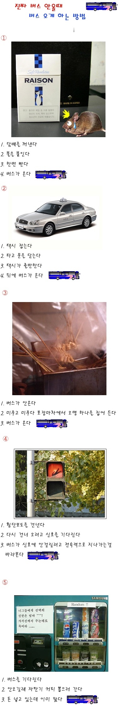 1. 버스가 안와서 공중전화박스로 간다 2. 동전을 넣고 번호를 누른다. 3. 신호가 가는 사이에 버스가 지나간다. 4.열나게 뛰어간다.