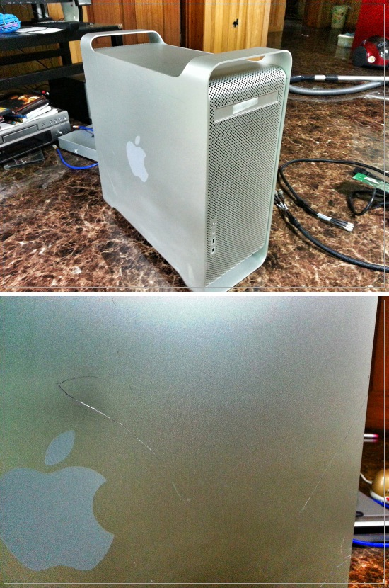 파워맥 G5 입니다. 컴퓨터 상태 좋으나 케이스 옆면에 사진처럼 상처 있습니다.