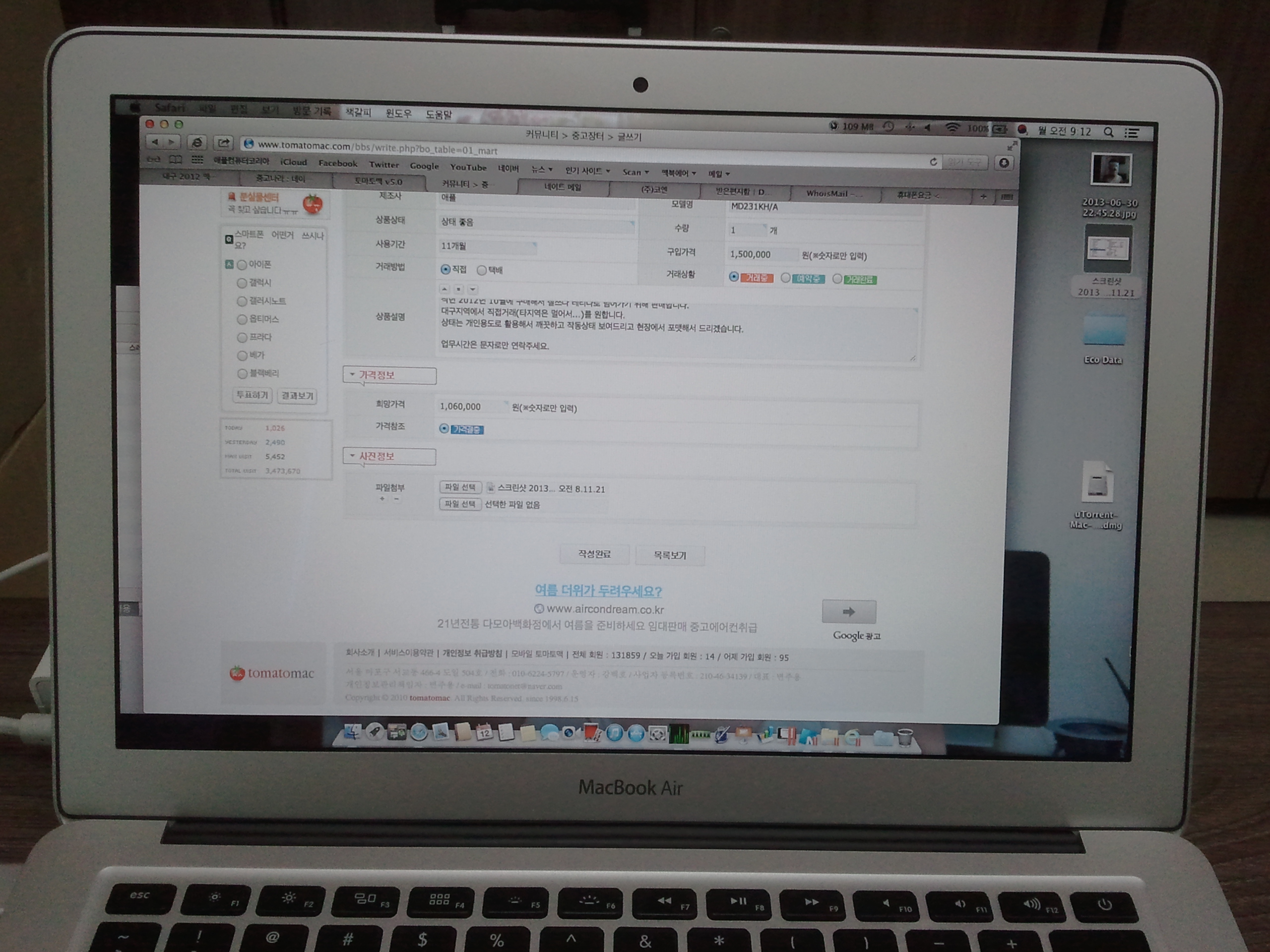 2012년 맥북에어 13 기본형 MD231KH/A 팝니다.
