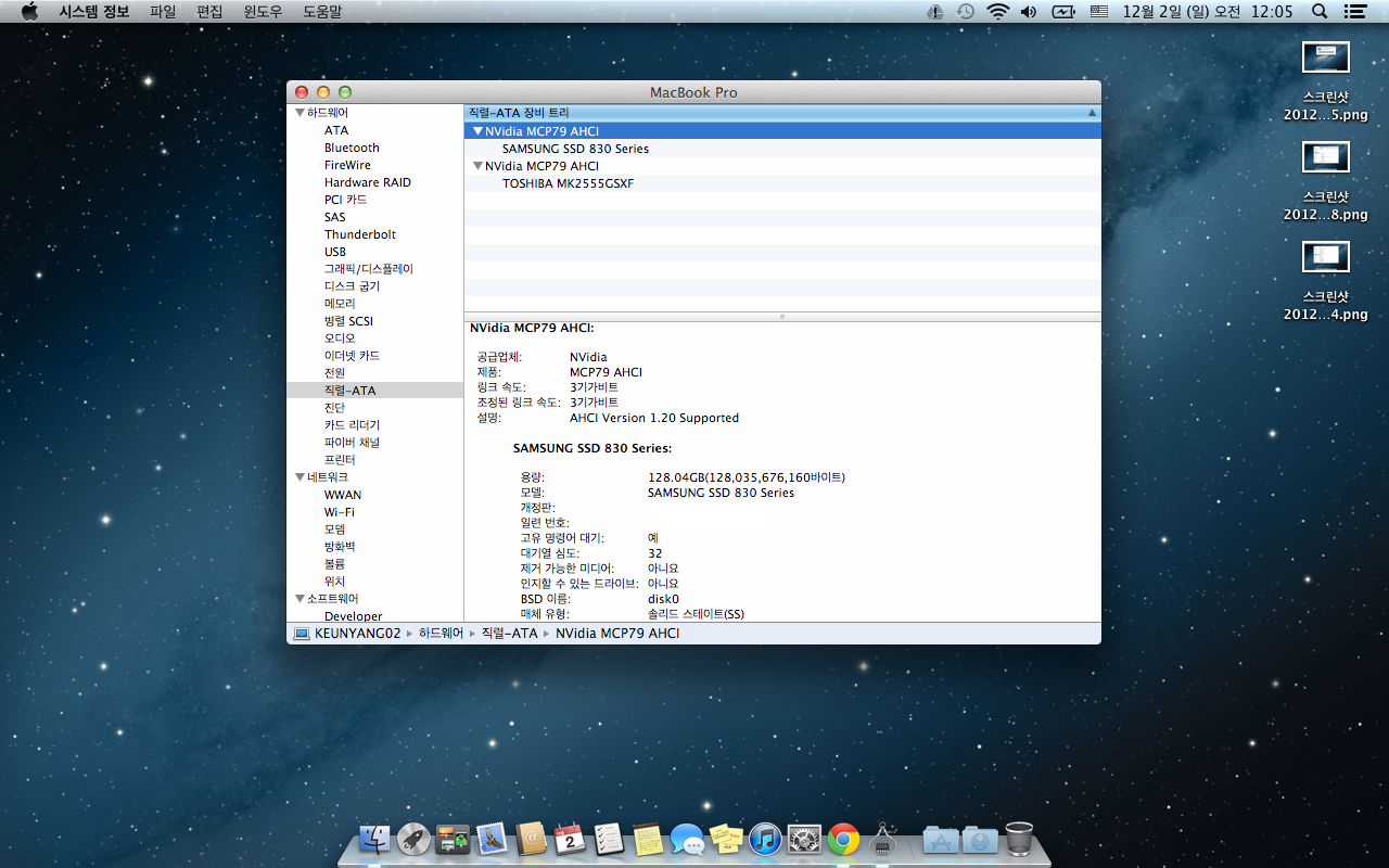 하드디스크 : Samsung SSD 830 Series (128G), Toshiba MK2555GSXF (250G) 서브