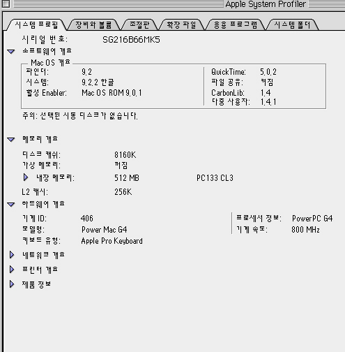 물론 지금 메모리 용량이 적은 탓에 속도 저하가 많을 듯하며, 512MB 두 개를 추가하여 OS 9이 지원하는 최대 메모리인 1.5GB로 사용을 하면 일부 개선은 있겠으나 대폭적인 속도의 향상은 기대하기 어렵습니다.