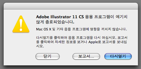 emoticon_096 하드안 >사용자 홈폴더(집모양아이콘)>라이브러리> Preferences폴더를 열고 일러스트 CS관련파일을 모두 삭제하세요.