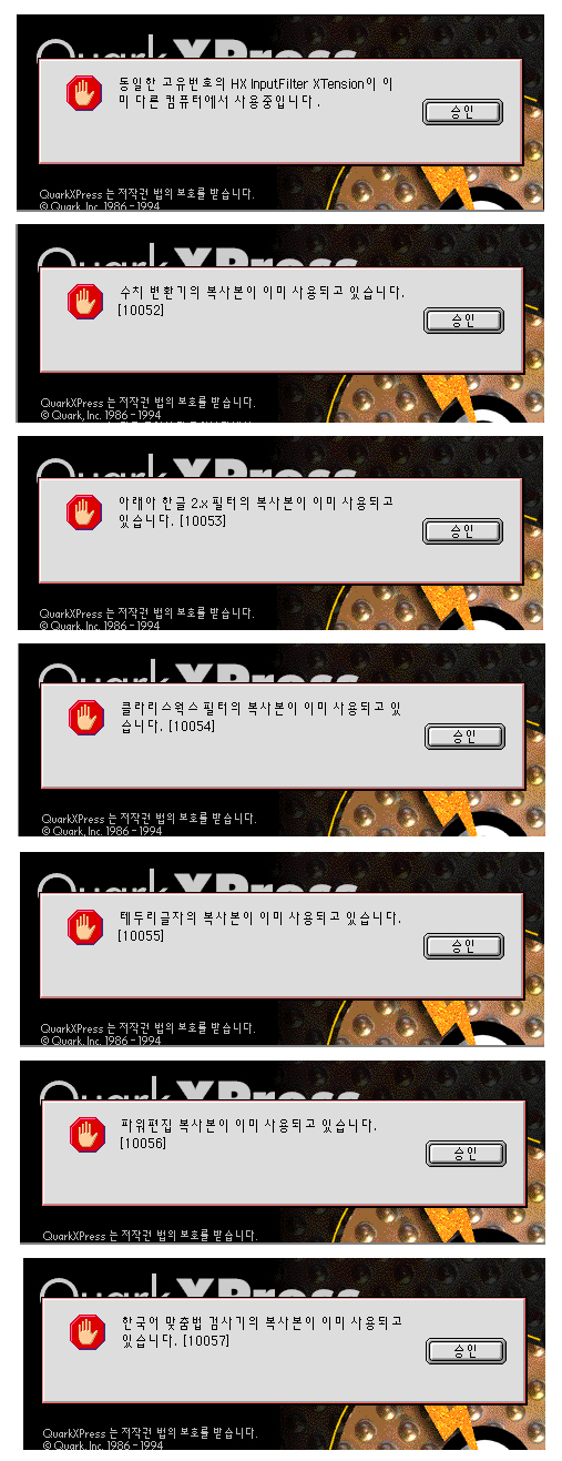 맥 컴퓨터가 모두 네트워크로 공유가 되는 경우 같은 번호에 XTension을 같이 사용하기 때문입니다. 방법은 락이 풀린 다른 버전에 쿽3.3을 사용해서 XTension버전에 충돌을 피하거나 선택자에서 비활성으로 네트웍을 끊고 사용해야 됩니다. 그렇나 비활성으로 사용하시면 인터넷도 안되고 맥끼리 공유도 안됩니다. 물론 레이져프린터도 사용이 안되고요. 자기소개 참고