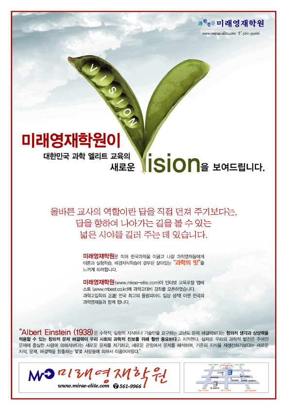 난 다른생각을 가지고 있는데... 모델도 좋지만 레이아웃 컬러티가 조금은 떨어진다고 보는데여,,, 명랑엉아 ^^ 저번에 애기한거 생각나네여 ㅋㅋ 공감미가 전혀 없습니다 해드카피나 부제목들이 제각기 노는듯한 느김이 더강해여 미래영재학원도 로고가 이상하구여 암튼 배이스나 바뀌고 문장이나  카피에선(편집) 바뀐게 없는게 조금 그럽니다.