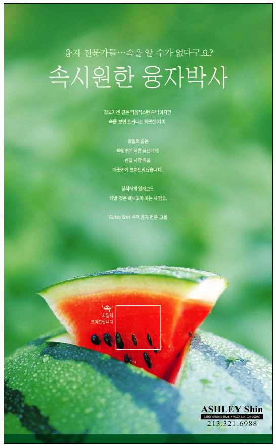 감사합니다~ 열분들~ *^^* 일단 일곳 엘에이는 한국에서 사기치고 도망온넘들이 많은 곳으로 사람을 특히 한국사람을 조심하란 말을 많이 하죠 -_-;;;; 그래서 속이는 넘들 많이 있습니다 된장할 넘들이져;;; 다시 정리해 주신 카피 정말 큰 도움이 될것 같습니다....재가 카피라이터가 없어서 저혼자 다해요 ㅜ.ㅜ 북치고 장구치구... 그리고 이미지 만드는 것은 자신있는데....폰트쪽에 약한지라..많은 조언 부탁드리고 조언 감사드립니다~ 좋은 하루 되세요~