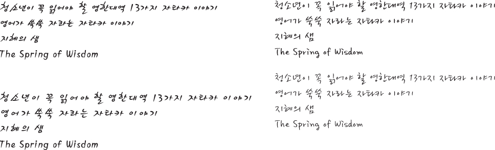 세종소주체, 봄날체로 좀 부탁드려용~~ Voyager 일반 0 3872 2009.01.19 19:00 -0001.11.30 00:00 vo.ai (0byte) + 31 > > 청소년이 꼭 읽어야 할 영한대역 13가지 자타카 이야기 > 영어가 쑥쑥 자라는 자타카 이야기 > 지혜의 샘 > The Spring of Wisdom > > 부탁드려용~~ >