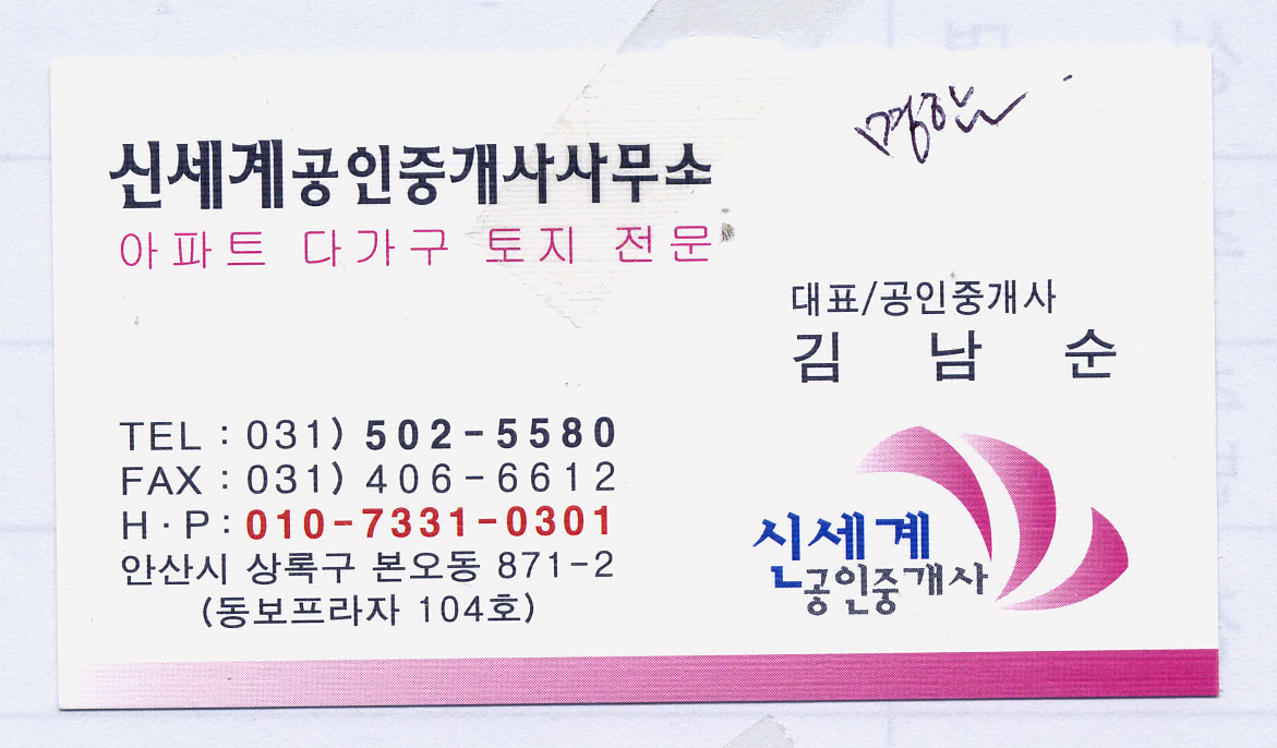 급히 글씨 부탁드립니다~ 조희진 일반 0 3972 2009.05.16 11:43 오늘 들어가야 하는 건데 글씨체가 없어서요~ 똑같이 해달라고 하셨는데~ 상호명하고 하단 상호명 부탁드립니다. 신세계공인중개사사무소 신세계공인중개사
